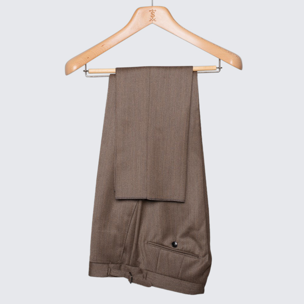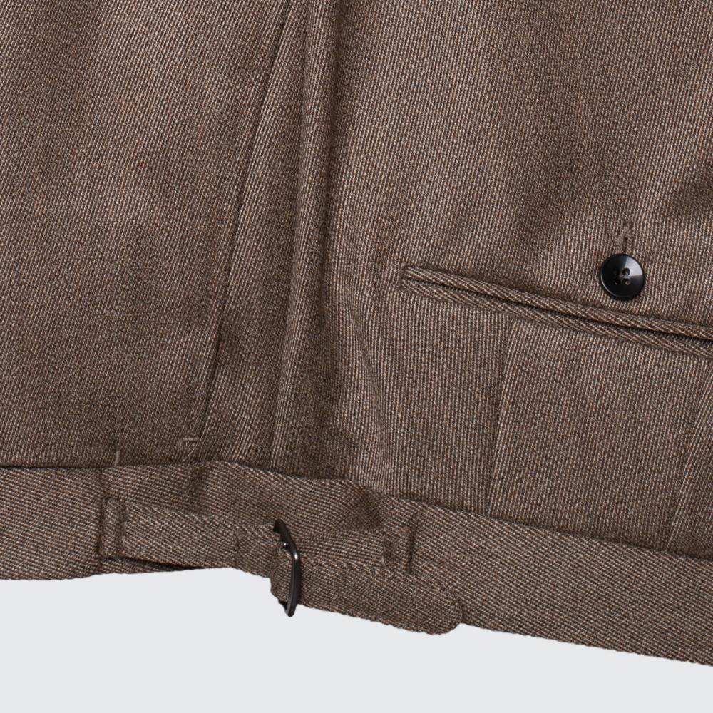 Ez a sokoldalú, sima elejű nadrág karcsúsított szabású, de nem szűk. Robosztus, mégis finom olasz gyapjúból készült, így ideális melegebb öltözéknek a hideg hónapokban. Oldalán állítható szűkítőpántja és a manapság megszokottnál kicsit magasabb dereka lehetővé teszi viselését méretre szabott zakóval, valamint lazább kombinációkkal is. A 18.5 cm széles alsó szegélynek köszönhetően könnyen párosítható elegáns cipővel vagy csizmával.